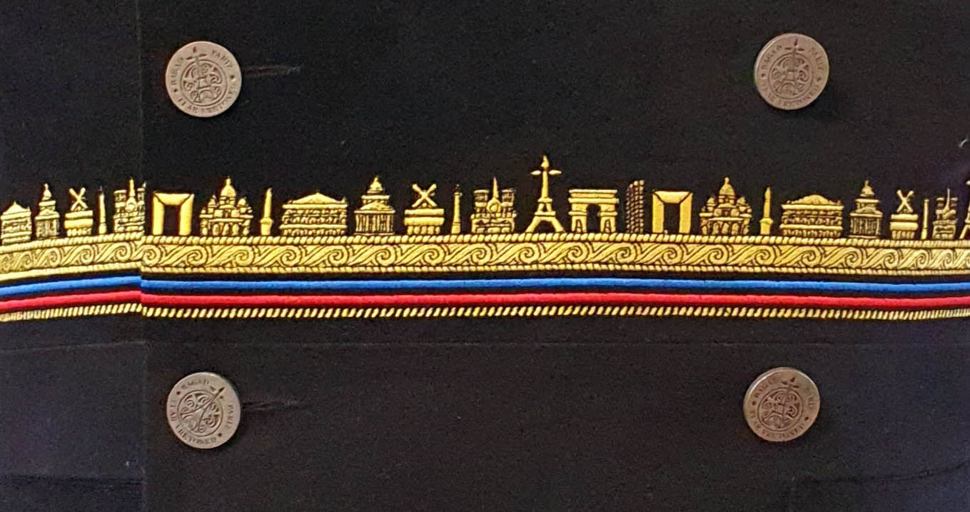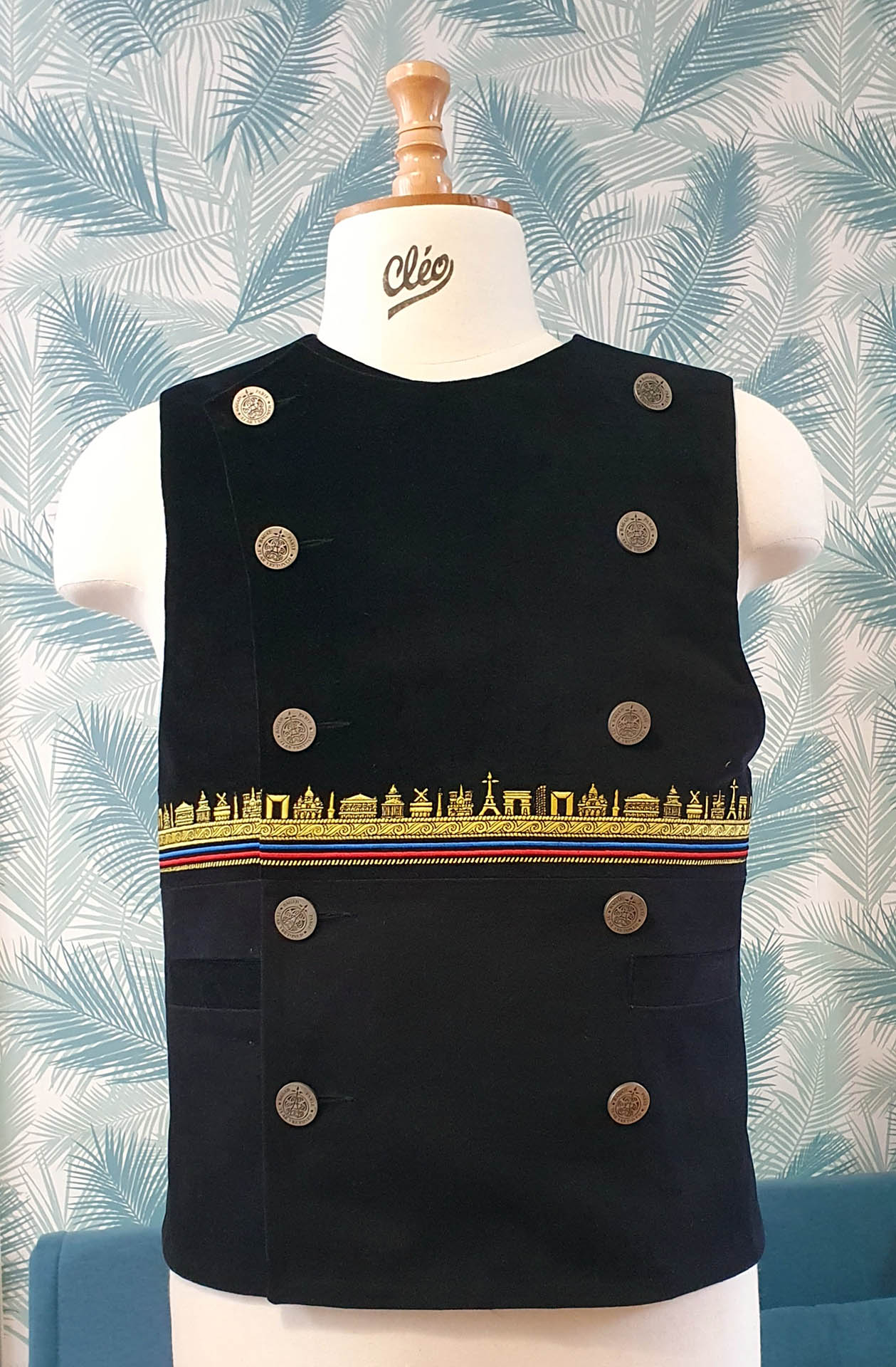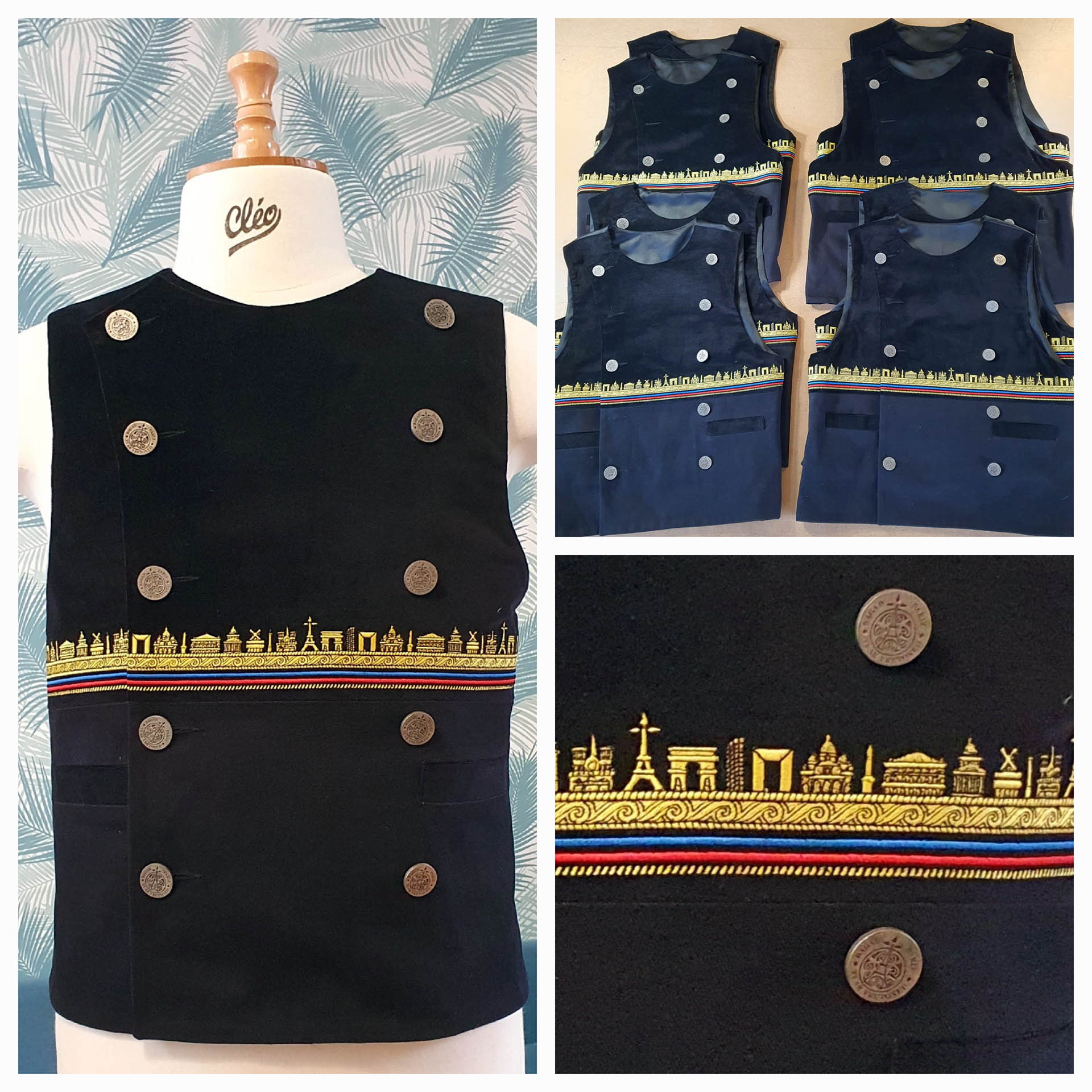 Chaque gilet homme est orné des boutons du bagad Pariz, représentant la Tour Eiffel surmontée d’une hermine.
