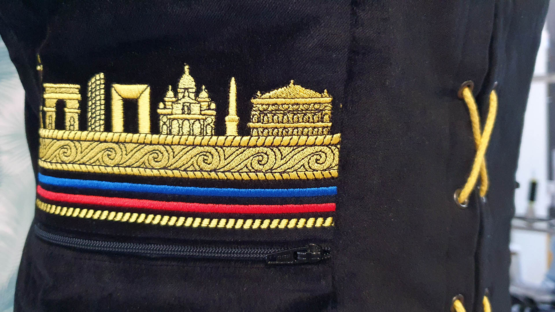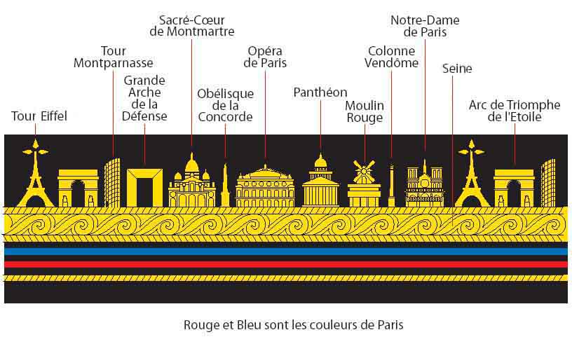 Le Bagad Pariz rassemble des sonneurs de différents terroirs, c’est pourquoi ils portent les couleurs et les monuments de la ville de Paris